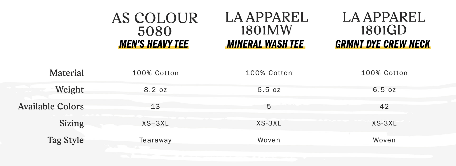 Today, we embark on a detailed journey into the world of men's custom t-shirts, focusing on three exceptional choices: the AS Colour 5080 Men's Heavy Tee, LA Apparel 1801MW Unisex Short Sleeve Mineral Wash Tee, and LA Apparel 1801GD S/S Grmnt Dye Crew Neck 6.5oz.