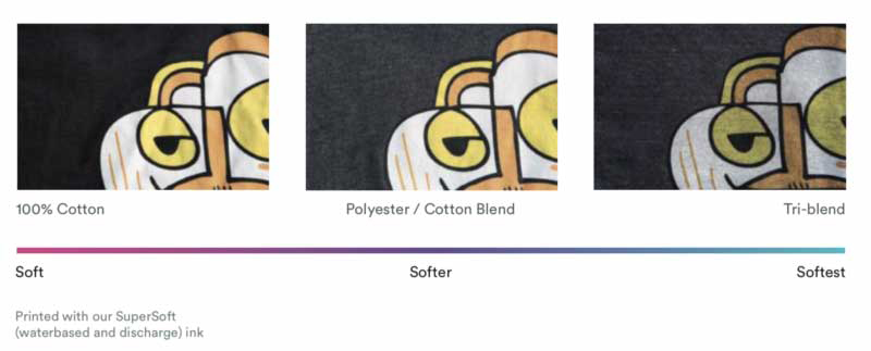 Another thing to know about cotton, cotton/poly, and tri-blend fabrics is that they all print differently. Assuming you want to throw a custom design on your shirt, the material's print results are something to consider.