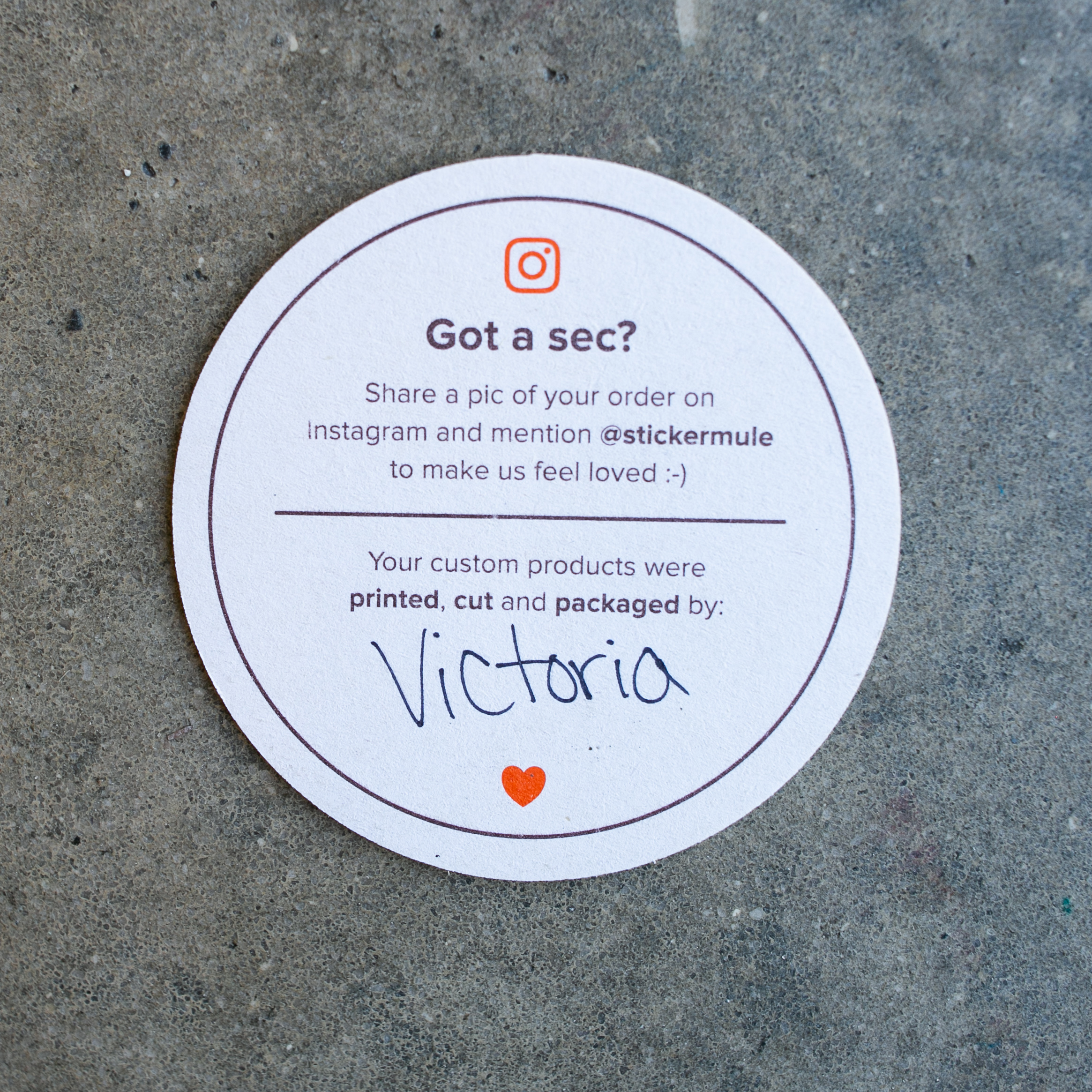 StickerMule sends a friendly reminder on a coaster that they include with every shipment of stickers they send out. It’s nothing revolutionary, but a simple reminder for someone to share their experience and tag the brand can go a long way.