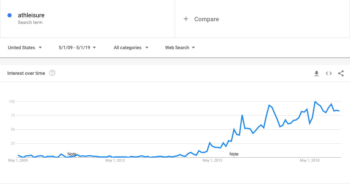 This chart shows the search popularity of the term "athleisure" over the past decade. You can see, it had virtually no traction until around 2015, but has increased steadily since then.